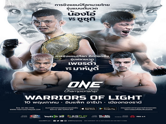 วันที่ 10 พค.นี้ พบกับ ONE: WARRIORS OF LIGHT ที่คุณจะได้พบกับนักกีฬาซึ่งเขย่าวงการมวยไทย มาปะทะกันอย่างสนั่นเวที โดยคู่หลักของรายการ คุณจะได้พบกับ น้องโอ๋ ไก่ย่างห้าดาว แชมป์โลกมวยไทย ที่จะขึ้นป้องกันแชมป์โลกมวยไทย ONE รุ่นแบนตั้มเวต กับคู่ท้าชิงจากประเทศญี่ปุ่น แชมป์โลกชูทบ็อกซิ่ง ฮิโรอากิ ซูซุกิ ทั้งนี้ ท่านจะได้พบกับ แชมป์โลกมวยไทย เพชรดำ เพชรยินดี อะเคดามี่ ปะทะ มาห์มูดี้ ในศึกชิงแชมป์โลกคิกบ็อกซิ่ง ONE รุ่นฟลายเวต เตรียมตัวกันให้พร้อมกับการต่อสู้ที่ท่านจะไม่มีวันลืม เพราะนักกีฬาทั้ง 4 ของเรา จะสู้อย่างเต็มที่ เพื่อช่วงชิงเข็มขัดแชมเปี้ยนบนสังเวียนนี้ นอกเหนือจากนี้เรายังมีนักกีฬาแถวหน้าระดับโลกทั้งจาก มวยไทย คิกบ็อกซิ่ง หรือการต่อสู้แบบผสมผสานก็ดี เพราะฉะนั้นอย่าพลาดชมการแข่งขันที่จะส่งตรงไปยังกว่า 26,000 ล้านวิว กว่า 140 ประเทศทั่วโลก พลาดไม่ได้ ซื้อบัตร และดาวน์โหลด ONE Super APP ตอนนี้!