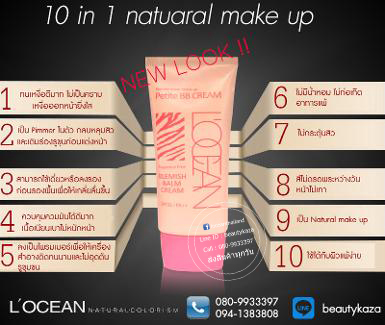 BB หน้าเด็ก Petite BB ขายดี No.1* BB อันดับ1 Petite BB น่าเด็ก บีบี น่าเด็ก ยิ่งใช้...ยิ่งเด็ก เหงื่อออก..ยิ่งใส ไร้คราบ https://www.facebook.com/LoceanThailand ติดต่อ สอบถาม 0809933397 Line1 : beautykaza Shop@Ladprao : 025121836 == ด้วยคุณสมบัติ 10 ประการ== - ทนเหงื่อ 100% เหงื่ออกหน้าใสไมเป็นคราบ - เป็น primmer ในตัว กลบหลุมสิวและเติมร่องรูขุมขนก่อนแต่งหน้า - SPF 25 PA++ กันแดดในตัว - คมมันดีมาก เนื้อเบาไม่หนักหน้า - ลงก่อนแต่งหน้าเพื่อให้รองพื้นและเครื่องสำอางตินทนมากขึ้น - ไม่มีน้ำหอม ไม่ก่อเกิดการแพ้ - ไม่กระตุ้นการเกิดสิว - สีไม่ดรอพระหว่างวัน หน้าไม่เทา - เป็น natural make up - ใช้ได้แม้ผิวแพ้ง่าย ------------------------------- == L'OCEAN N-A-T-U-R-A-L-C-O-L-O-R-I-S-M== ------------------------------- >>> BB เปอร์ตี Petite จาก L'OCEAN โลแซง เกาหลี BB Petite มันดีมากกกกกกกก...... --> กันเหงื่อ ทนน้ำ เหงื่อยิ่งออกหน้ายิ่งใส --> หน้าฉ่ำ อำพรางรูขุมขขนเป็นเลิศ --> ใช้เป็นไพรมเมอร์ในตัวได้ด้วย มันเจ๋งตรงนี้ !!! --> ใช้ได้แม้คนเป็นสิว --> เนื้อโปรงแสงเบาสบายไม่หนักหน้า --> ปกปิดอำพรางรูขุมขนดีเยี่ยม --> ทนเหงื่อดีเว่อร์ ลงน้ำได้ไม่เป็นคราบ --> ยิ่งใช้ ยิ่งเด็ก เพราะในตัว BB มีส่วนผสมของสารต้านอนุมูลอิสระ ช่วยลดการเกิดริ้วรอย และบำรุงให้ผิวไม่แห้ง แต่ไม่ทำให้ผิวมันด้วยค่ะ ------------------------------- >>> คุณสมบัติอ้างอิง <<< ------------------------------- 1. สามารถใช้เป็นเป็นบีบี หรือ เบสไพรมเมอร์ หรือ กึ่งรองพื้น 2. ป้องกนรังสี UV จากแสงแดด SPF 25PA++ 3. มีคุณสมบัติปกปิดจุดด่างดำ และอำพรางรูขุมขน รวมถึงทำให้การแต่งหน้าง่ายขึ้น เมคอัพที่ลงหลังจาก บีบี ตัวนี้ จะเกลี่ยง่าย และลื่นผิว 4. ลดการเกิดสิว และ ลด sebum สาเหตุของการเกิดสิว และช่วยควบคุมความมัน ให้กับผิว พร้อมลดอัตราการผลิตน้ำมัน ของต่อมไขมัน แต่ไม่ทำให้ผิวแห้งผาด คนเป็นสิวจึงใช้ได้ และเหมาะมาก 5. บีบี เปอร์ตี Petite ไม่มีน้ำหอม และไม่ก่อให้เกิดการระคายเคือง เป็น natural make-up จึง เหมาะกับผู้ที่มีผิวแพ้ง่าย และ sensitive ใช้ได้ โดยไม่ต้องกลัวแพ้ การรันตี ไม่แพ้ 6. บีบี เปอร์ตี Petite ยังทำหน้าที่เป็นไพรมเมอร์ ป้องกันการอุดตันของรองพื้น หรือ เครื่องสำอางอื่น ไม่ให้ไปฝังใต้ผิวได้อีกด้วย >>> วิธีใช้ <<< 1. สามารใช้ร่วมกับรองพื้น หรือ ใช้เดี่ยวเดี่ยวก็ได้ 2. แนะนำให้ใช้ลง ก่อนรองพื้น และการแต่งหน้า เพราะ บีบี เปอร์ตี Petite ยังทำหน้าที่เป็นไพรมเมอร์ ป้องกันการอุดตันของรองพื้น หรือ เครื่องสำอางอื่น ไม่ให้ไปฝังใต้ผิวได้อีกด้วย